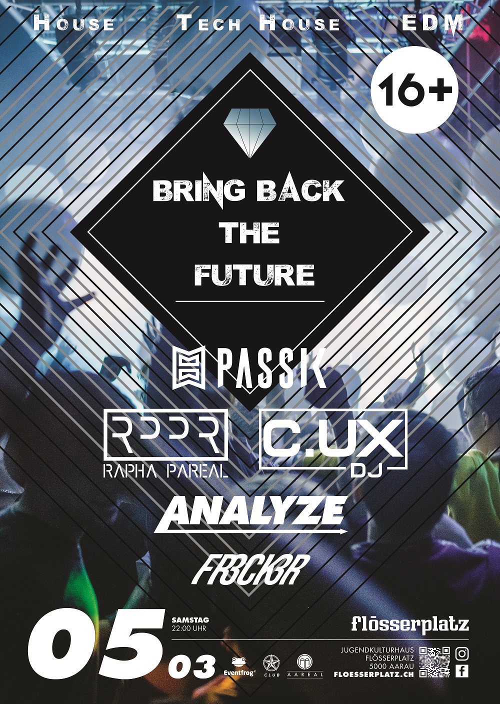 Partys im Flösserplatz sind grundsätzlich für alle Besucher:innen ab 16 Jahren zugänglich. Einlass nur mit amtlichem Ausweis (Pass, ID, Führerausweis, Ausländerausweis).