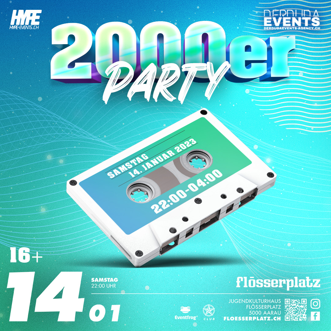 Die 2000er Party von Hype Events ist jetzt auch im Flösserplatz Aarau. Wir bringen mit dieser Art Party ab 16 frischen Wind in die Partyszene! Solange habt ihr nun gewartet! Ob noch vom letzten Jahrhundert oder doch 2000er Jahrgang, SPIELT KEINE ROLLE! Kommt in den Flösserplatz und zeigt uns was ihr könnt!