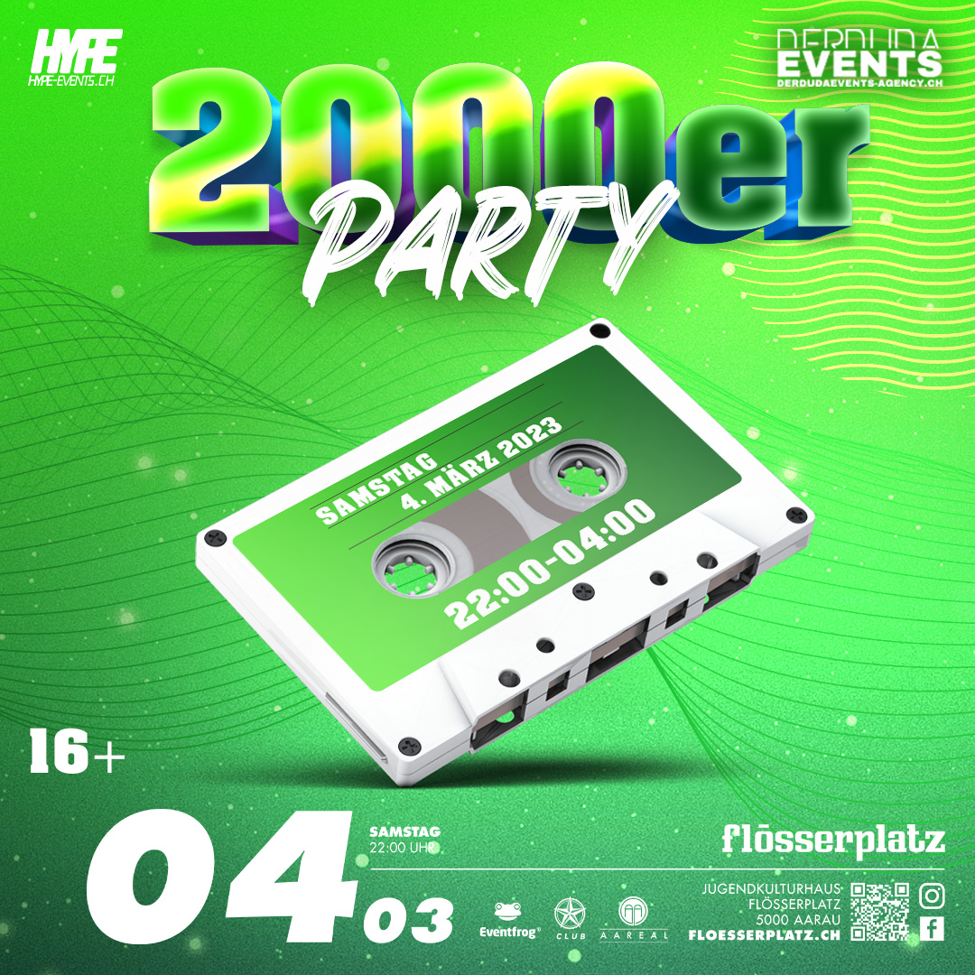 Die 2000er Party von Hype Events ist jetzt auch im Flösserplatz Aarau. Wir bringen mit dieser Art Party ab 16 frischen Wind in die Partyszene! Solange habt ihr nun gewartet! Ob noch vom letzten Jahrhundert oder doch 2000er Jahrgang, SPIELT KEINE ROLLE! Kommt in den Flösserplatz und zeigt uns was ihr könnt!